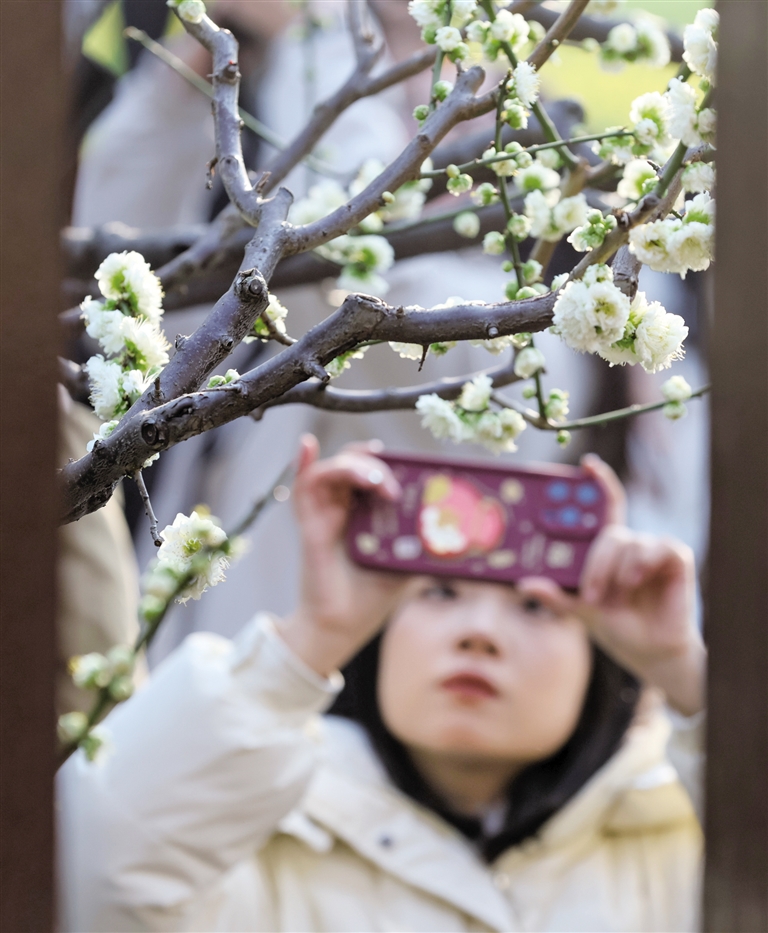 3月8日,游客在上海静安雕塑公园赏花。气温回暖,春回大地,人们纷纷走进大自然拥抱春天。 摄影/新华社记者 王 翔