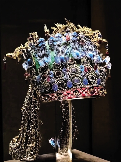 点翠工艺则是将金、银片制成花形底托,用金丝沿着图案边缘焊槽,在中间部位涂上胶水,再将从翠鸟身上拔取的羽毛精心镶嵌在座上,形成吉祥精美的图案,图案上还镶嵌珍珠、翡翠等珠宝玉石。此冠的点翠难度极大,不仅点翠面积大,涵盖翠凤、翠云、翠叶、翠花等,而且形状复杂。尤其是翠凤,均作展翅飞翔状,凤尾展开,羽毛舒展,极富灵动感。
