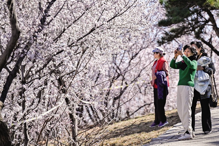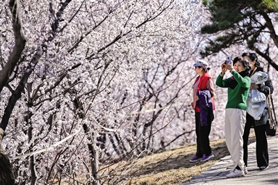 3月19日,游客在北京老山城市休闲公园赏花拍照。近日,位于北京石景山区的老山城市休闲公园山桃花等春花盛开,浓浓春意吸引了大量游客前来踏青赏花。 摄影/新华社记者 张 铖