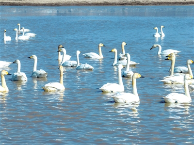 3月18日,大批天鹅在呼和浩特市土左旗哈素海湖面上梳羽、嬉戏,与金黄的芦苇、湛蓝的湖面构成一幅唯美的画面。近年来,土左旗通过对哈素海水质治理、湿地保护等措施,湖水透明度显著提升,碱性的富矿物质水体为天鹅等珍禽提供了理想栖息环境,目前监测到的鸟类共有230余种,相比历史种群数量正逐年提升。