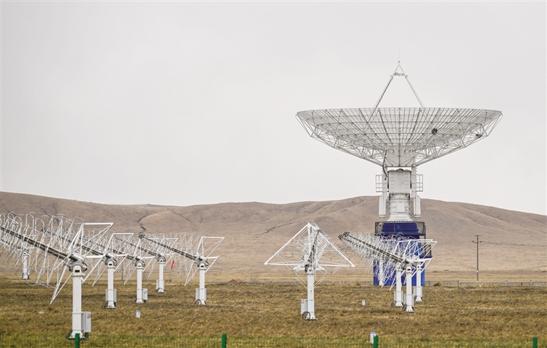 在内蒙古自治区锡林郭勒盟正镶白旗明安图镇附近的草原上,坐落着国家天文台明安图观测基地。基地内安装了100面射电频谱日像仪,子午工程二期大型监测设备之行星际闪烁监测望远镜也坐落于此。图为3月24日在国家天文台明安图观测基地拍摄的射电频谱日像仪天线。摄影/新华社记者 彭 源