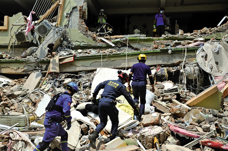 紧急驰援缅甸的中国多支救援队正冒着酷暑紧张工作,争分夺秒,抢救生命。