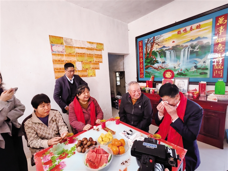 4月2日8时,车队从江阴市出发,近两小时后到达江苏省溧阳市上兴镇水西村。在这里,刘建军年迈的哥哥、姐姐等亲人早已打扫好老房子,焦急地等待着。车队缓缓驶入村里,周家老宅门口鞭炮声震天。84岁的周菊仙、75岁的周全根与阔别65年的弟弟抱头痛哭。