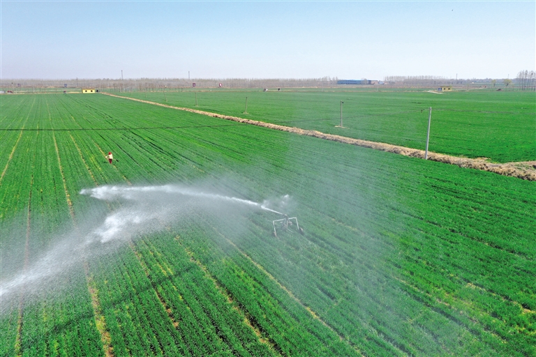 4月6日,在山东省青岛市即墨区段泊岚镇瓦戈庄村绿色增粮先行示范区,农民采用卷盘式喷灌设备为小麦浇水。眼下,正是小麦拔节管理的关键期,在青岛市即墨区的田间地头,农民们抢抓农时,对小麦进行节水灌溉和高效管理,为夏粮增产丰收打下基础。