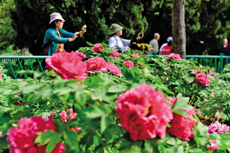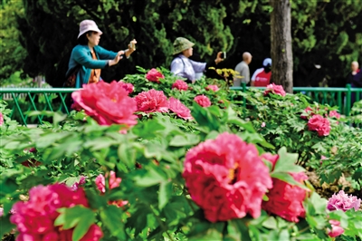 4月8日,在菏泽市曹州牡丹园,盛开的牡丹吸引游客驻足欣赏。当日,“中国牡丹之都”山东省菏泽市举办第34届菏泽国际牡丹文化旅游节,盛邀四方宾朋前来赏牡丹看美景。 摄影/新华社记者 郭绪雷