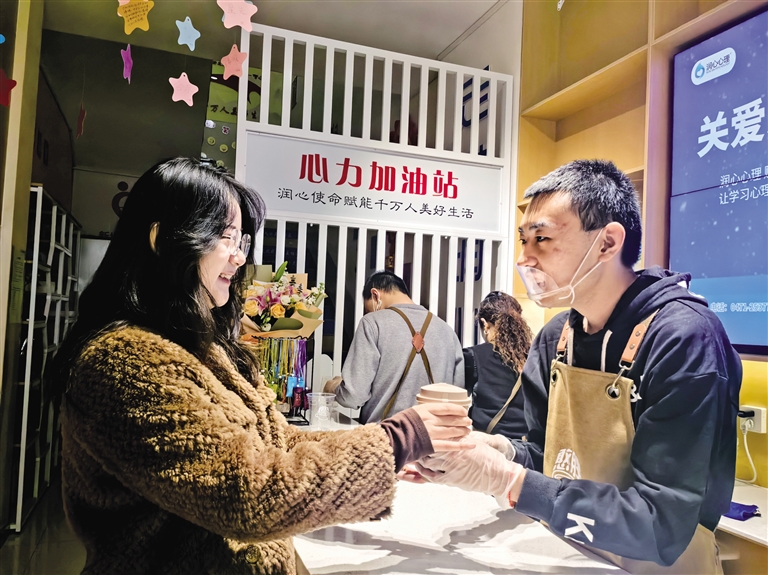 推开咖啡馆店门,迎面而来的是满墙温暖的标语——“关爱来自星星的孩子”,吧台上摆放着店员手写的便签:“我可能说话有点慢,但咖啡一定够香浓”。还有顾客暖心的留言:“无论遇到什么困难,拥抱星星的孩子都是坚强勇敢的”“祝孩子们能用自己的双手为我们的世界增添更多美好和希望”……