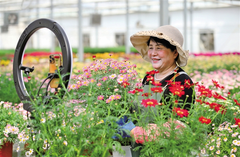 4月13日,花农在即墨区灵山街道百亿绿洲花卉种植基地通过电商直播销售花卉。近年来,山东省青岛市即墨区灵山街道以现代设施农业为抓手,推动花卉产业集约化发展,依托“龙头企业+合作社+农户”联农带农机制,打造集组培育苗、现代化种植、电商销售于一体的产销模式,为农业高质量发展注入新活力,促进农民增收,助力乡村振兴。(据新华社报道)