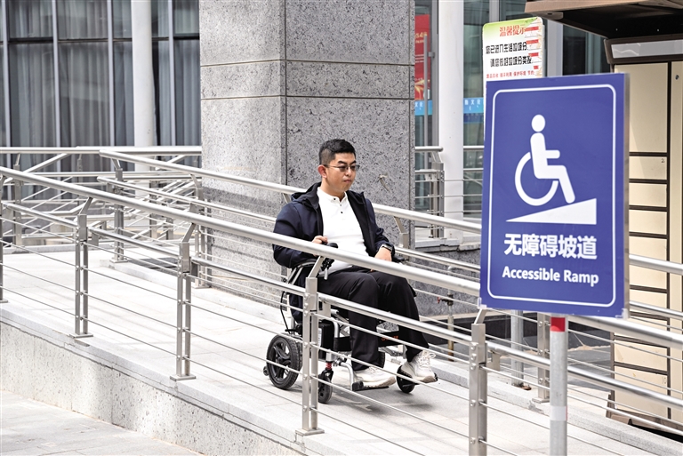 4月15日,一名残障人士坐轮椅通过鄂尔多斯市文化馆外无障碍坡道。