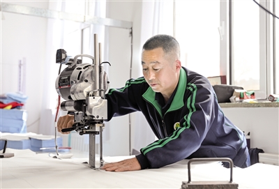 4月16日,一名残障人士在东胜区残疾人辅助性就业基地裁剪布料。