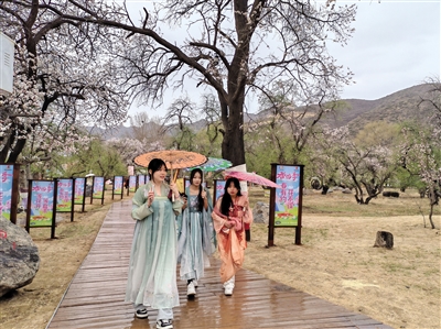 10时,红山口村已是一片欢声笑语。蜿蜒的山路上,游客漫步花海,或举起手机定格春日瞬间。身着汉服的人们穿梭于杏林间,成为镜头追逐的焦点。“我从小在这里长大,但每年杏花开时都像第一次见到一样震撼。”李女士坦言,自2017年接触汉服后,便以日常穿戴的方式推广传统文化。