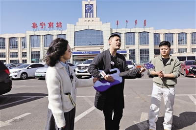 在集宁南站,乌兰察布80后歌手王彦楠抱着吉他深情款款地唱起他的新歌:“绿皮火车摇晃着向北的承诺,杭州站台渐远了童年的轮廓,姥姥手心的温度,暖过塞北的风……”看到你的作文后,王彦楠深受感动,专门创作新歌《旧轨还乡》。质朴的歌词、舒缓的旋律,唱出无数游子的思乡之情。王彦楠已经将新歌发给了你,他说:“我猜张潇冉同学已经收到了我的新歌。我祝她中考顺利,天天快乐,常回家看看。”