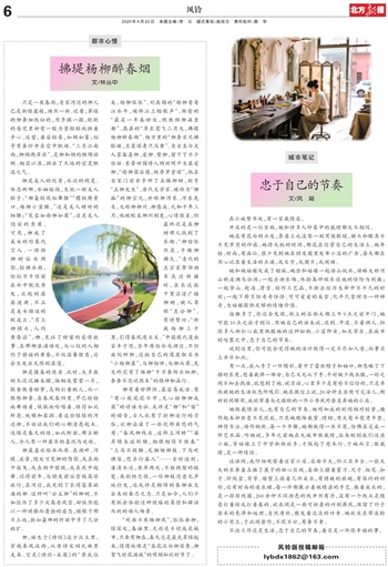 柳有着好脾性,最容易成活。有“有心栽花花不开,无心插柳柳成荫”的谚语为证。或许是“柳”和“留”的谐音,古人就有了折柳送行的习俗,让柳沾染了一些忧郁离愁的气质:“春风柳线长,送郎上河桥”“灞岸晴来送别频,相偎相倚不胜春”“上马不捉鞭,反拗杨柳枝。下马吹横笛,愁杀行客人”……古时送别,凄清水边,舟岸两处,不胜挽留的酸楚、离别的悲伤,一任柳枝恣意无声地抒发,这或许是缠绵的春柳派生出来的眷恋之态。只是如今,人们少有机会体验这种缱绻的柔情和挥泪而别的动人场景。