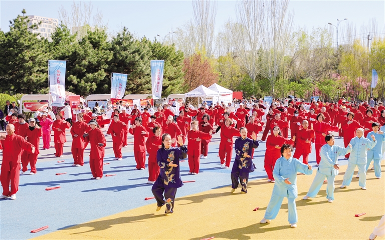 4月27日,由呼和浩特市体育局主办,呼和浩特市“五个一万”全民健身活动——万人太极拳展示活动在丝绸之路公园精彩呈现。活动现场,健身爱好者们动作流畅自然,既有力道又不失柔美,展现中华武术的深厚底蕴与精妙绝伦。“五个一万”全民健身活动是呼和浩特市一项品牌全民健身活动,突出“科学运动,有益健康”的理念,活动时间跨度长,参与人数多,形式多样,深受群众喜爱和欢迎。摄影/草原云·北方新报首席记者 牛天甲