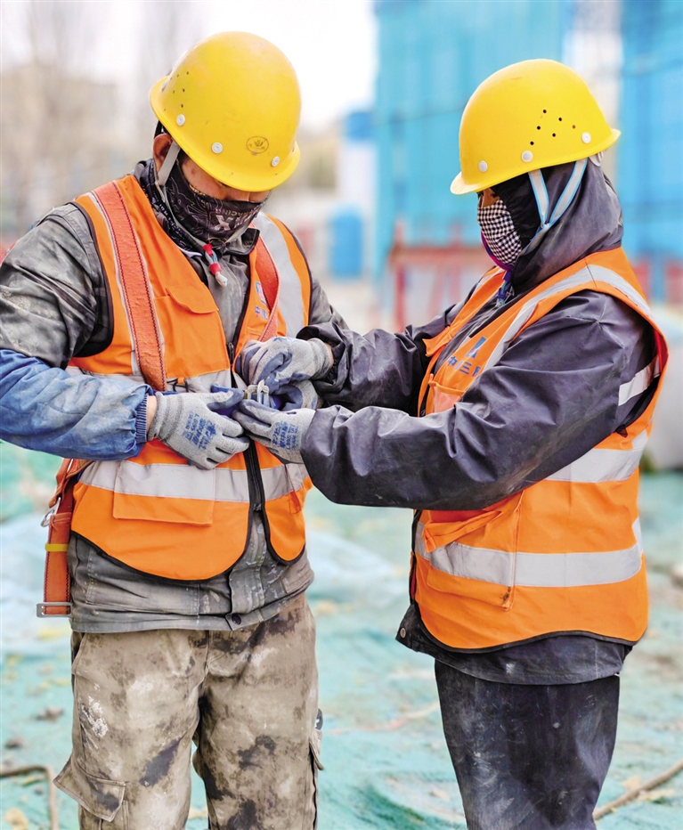 陈立国负责外墙保温,需要登上吊篮进行高空作业。张海红做小工,帮忙清理垃圾、递送材料。系紧安全帽、整理安全带……每天上岗前,张海红要为丈夫整理着装。这已成为夫妻俩的“岗前仪式”,安全是每天的必修课。