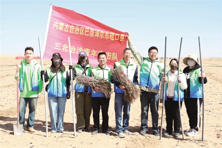 4月24日,巴彦淖尔市磴口县全民义务植树现场,获得“2025年度中国青年五四奖章”的集体——磴口县三北治沙青年突击队的队员们正埋头苦干,大家穿梭在沙间,为沙棘栽植全程把关。
