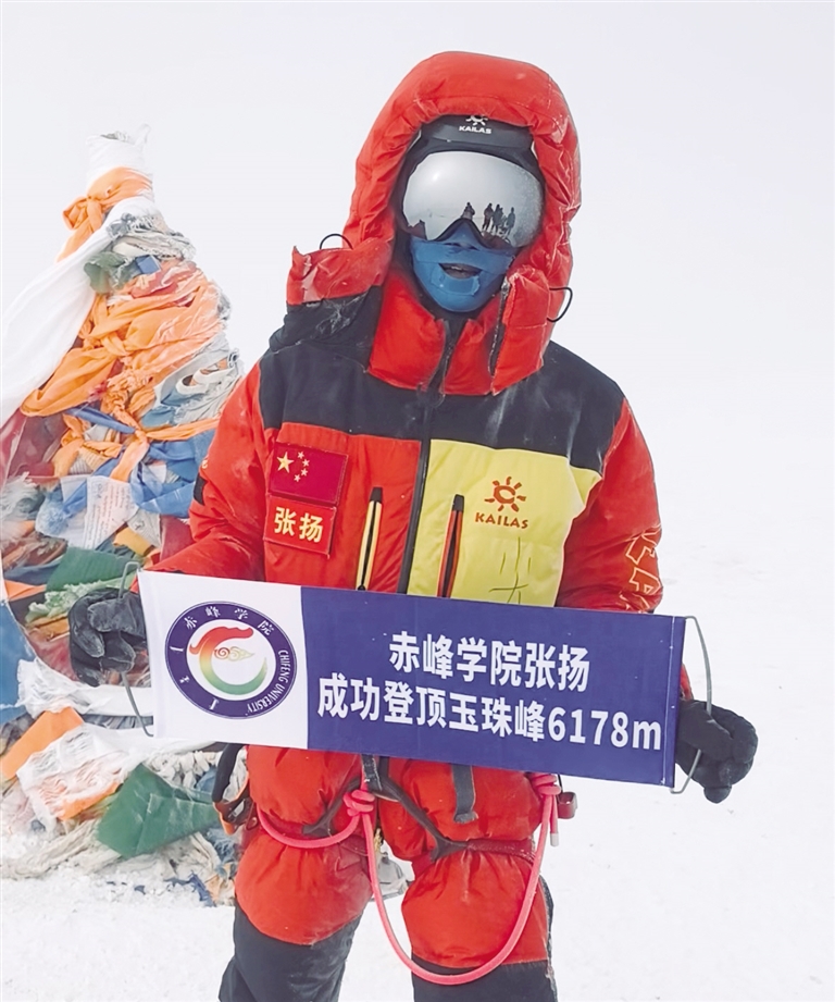 这位大学生名叫张扬,今年20岁,是赤峰学院大二的学生。5月4日,当他耗时6个小时完成冲顶后,激动得热泪盈眶。这是自他踏入户外运动领域起,便在心中立下的梦想坐标。