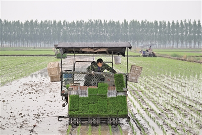 5月8日,在天津市宁河区东棘坨镇东赵村,农户驾驶水稻插秧机在田间工作。时下正值天津小站稻插秧季,天津市宁河区约20万亩小站稻大规模机械化插秧陆续开始,为秋后丰收丰产打下基础。摄影/新华社记者 孙凡越