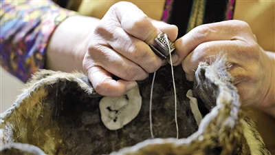 满古梅说,自己是家族第五代传人,做了几十年民族传统服饰的她,熟练掌握选料、熟皮、裁剪、缝制、染色、防虫、防潮、防腐八大制作工艺,能够制作鄂伦春族狍皮服装、狍角帽、考浩捞(手套)等制品。