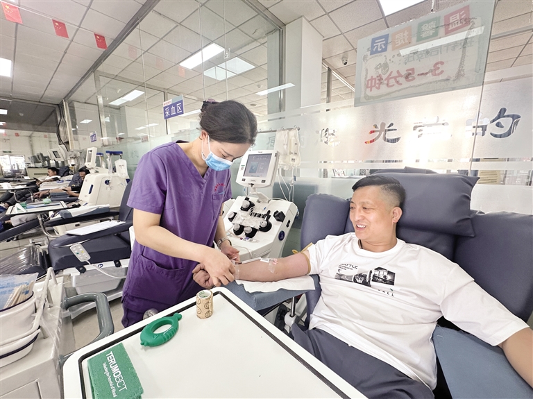 还有这样一位“热血战士”,用二十年如一日的坚持,书写着生命的赞歌。王瑞军,一位曾经的武警战士,如今从事培训工作。18岁时在部队第一次献血,至今,王瑞军已经坚持献血20年,累计献血量达4100毫升。他对记者说,献血能促进自身血液循环与新陈代谢,有益身体健康,也希望通过自己的微薄之力,为那些急需用血的患者送去生的希望,助力延续他人生命。