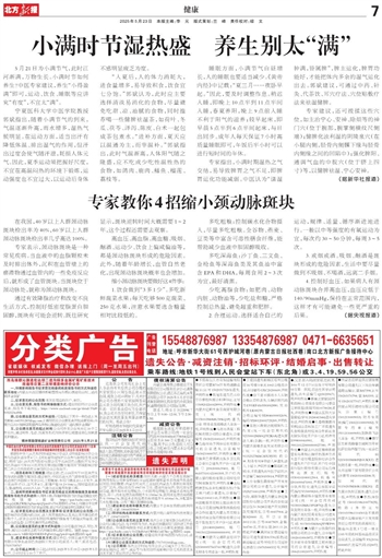 宁夏医科大学中医学院教授郭斌指出,随着小满节气的到来,气温逐渐升高,雨水增多,湿热气候明显。在运动方面,适当出汗有降低体温、排出湿气的作用,但汗出过度会使气随汗泄,耗损人体元气。因此,夏季运动须把握好尺度,不宜在高温闷热的环境下锻炼,运动强度也不宜过大,以运动后身体不感明显疲乏为度。