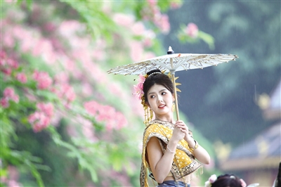 5月25日,游客在雨中的云南省景洪市曼听御花园景区拍照。