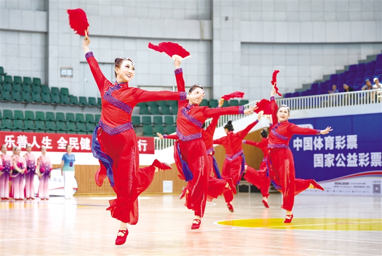 5月27日,陕西省老年人体育协会代表队在比赛中。当日,2025年全国老年人健身秧歌交流活动规定项目比赛在新疆维吾尔自治区奎屯市体育馆完赛。本次活动由中国老年人体育协会主办,共有来自全国18支代表队的200余人参加。摄影/新华社记者 徐宏岩