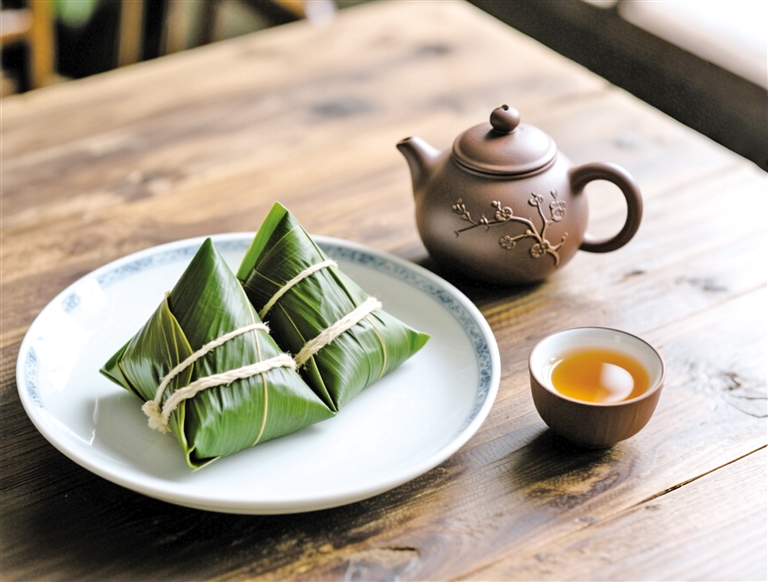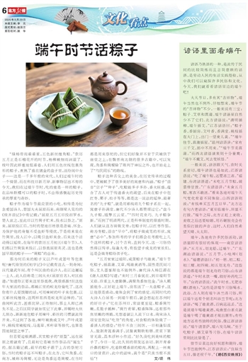 “五月家家过端阳,咸蛋粽子与雄黄。”端午节吃粽子,插菖蒲、艾草,喝雄黄酒等,固然是民间习俗,文人墨客却也不能例外。唐代诗人杨巨源在《谢人送粽》写道:“来时三月春犹在,到日端阳节又临。珍重主人意勤腆,满槃角黍细包金。”诗人羁旅他乡,正好赶上端午,房东送了一大盘粽子,这让他很是感动,竟体会到了家的感觉。而同时代的大诗人白居易一到端午前后,就会想起在苏州时的好日子:“忆在苏州日,常谙夏至筵。粽香筒竹嫩,炙脆子鹅鲜。”筒竹青翠,粽香阵阵,还有那外焦里嫩的烤鹅,光想着就让人流下口水。南宋诗人项安世则从“吃货”的角度,对食粽的体验做了一番诱人的描绘:“经年不食三闾饵,一日相逢似故人。旋剥青菰香满手,试餐黄颗软粘唇。蔗浆下箸甘无敌,昌本浮杯小作巡。”好久没吃到美味的粽子了,今日一见,比久别的朋友还亲切。剥开青香扑鼻的粽叶,吃着软糯香甜的粽肉,再配上一杯爽口的甘蔗汁,此中的滋味,真个是“只羡当前不羡仙”!文/项 伟