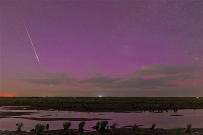 6月1日,在双鸭山市集贤县拍摄的极光和流星。