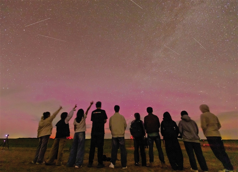 6月1日,在佳木斯市桦川县,摄影爱好者们在极光下留影。