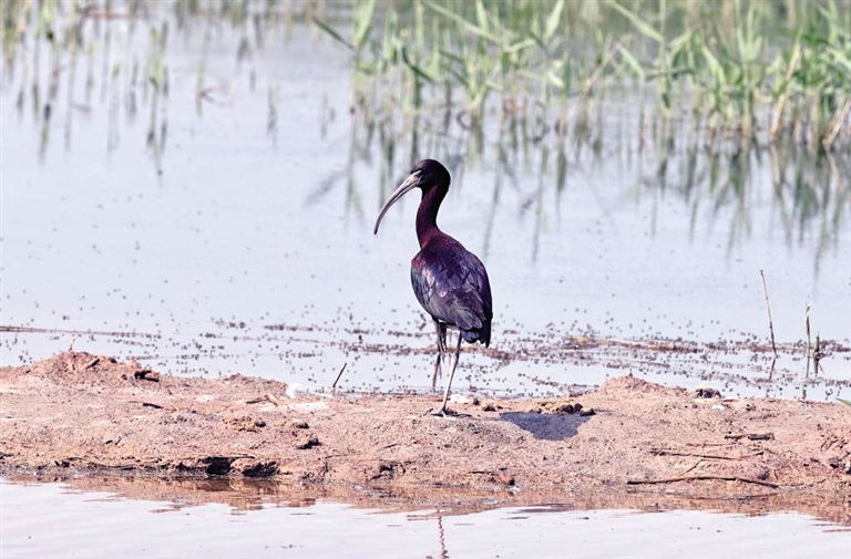 据乌拉特国家级自然保护区管理局局长陈峰介绍,工作人员在进行乌梁素海水鸟繁殖期调查监测时,发现一只彩鹮正在湿地歇息,这是他们首次在乌梁素海记录到彩鹮,进一步增加了在乌梁素海湿地栖息的鸟类品种。