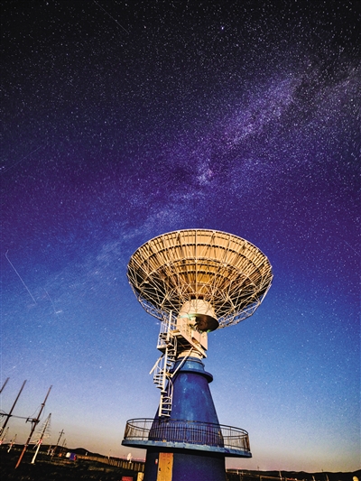 这是6月8日在国家天文台明安图观测基地拍摄的银河下的射电频谱日像仪天线(堆栈照片)。在内蒙古自治区锡林郭勒盟正镶白旗明安图镇附近的草原上,坐落着国家天文台明安图观测基地。夜色中,银河与天线交相辉映。摄影/新华社记者 马金瑞