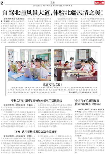 在交旅融合试点建设中,鄂尔多斯机场“干支通、全网联”交旅融合案例、“草原之星”额济纳号旅游专列入选第一批全国交通与旅游融合发展典型案例;“千里草原风景大道”、呼和浩特-乌兰浩特红色旅游航线分别入选第二批全国交通与旅游融合发展干线旅游公路、航空旅游产品典型案例;锡林郭勒千里草原风景大道入选“驾游中国”最受欢迎全国自驾旅游精品线路,赤峰市翁牛特旗乌丹至白音套海生态旅游产业路获评全国“十大最美农村路”……一批具有特色的交旅融合精品线路吸引区内外游客前来打卡。