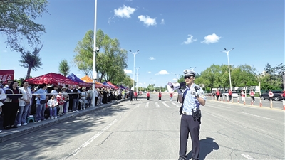 考场内,学生们奋笔疾书。考场外,张广旭和同事们严阵以待,全力保障交通秩序。清晨,他到达考场周边,开始部署交通管制,引导车辆有序通行,清理违停车辆,为考生开辟出一条畅通无阻的“绿色通道”;考试过程中,他时刻关注着周边情况,警惕突发状况,维持考场周边秩序,杜绝噪音干扰,为考生营造安静的考试环境;遇到考生因各种突发状况求助,他总是第一时间伸出援手,或帮忙联系家长,或驾驶警车护送考生及时到达考场。