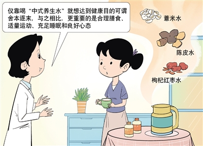 “仅靠喝‘中式养生水’就想达到健康目的可谓舍本逐末,与之相比,更重要的是合理膳食、适量运动、充足睡眠和良好心态。”孙青说。(据新华社报道)