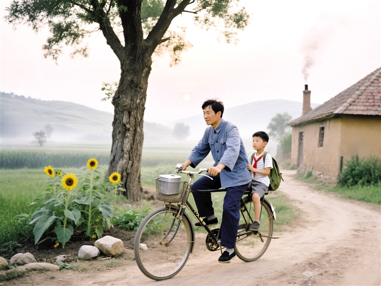尽管物是人非,但我找到了记忆中的老榆树。站在树下,我惊喜又感伤地发现,它依然枝繁叶茂,如守护者般伫立。恍惚间,我仿佛看见父亲骑着自行车驮着我经过老榆树下。那一瞬间,父亲远去的背影又浮现眼前,车铃摇碎晨光,在乡间小路上撒下一串清亮的回响——那是比勋章更耀眼的光芒,也是最温柔的父爱箴言……