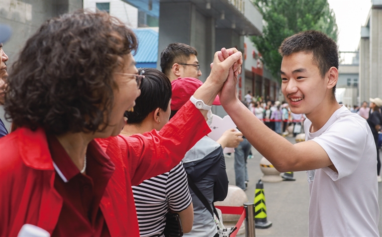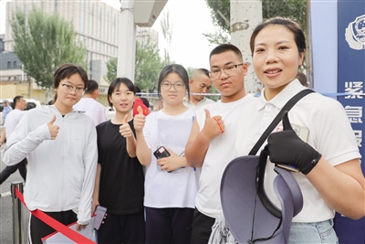 “努力,无需焦虑!”“发挥平时水平就好!”在第三十四中学考场外,送考家长与老师们以坚定的击掌传递鼓励,以温暖的拥抱缓解紧张情绪,话语中充满关切与信任。一些妈妈选择穿上旗袍,寓意“旗开得胜”,祝福考生一切顺利。