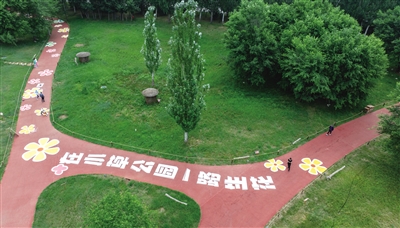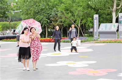 7月1日,游客在呼和浩特小草公园花路上游玩。呼和浩特小草公园打造的“花漾互动空间”于日前正式亮相,该空间总面积3300平方米,总长约500米,一朵朵色彩缤纷的“鲜花”挣脱土地束缚,绽放在脚下,把单调的路面变成浪漫花毯,吸引了众多游客。