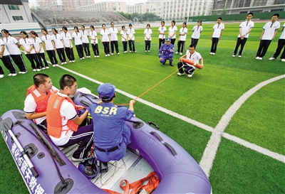 7月2日,河北省遵化市第一中学的学生在体验水上救援过程。暑假来临,各地开展暑期安全教育主题活动,提高学生们的安全意识和自救自护能力。(据新华社报道)