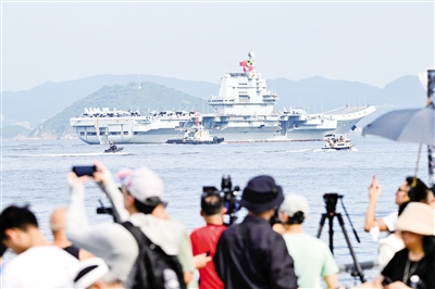 人们在岸上拍摄海军山东舰抵达香港