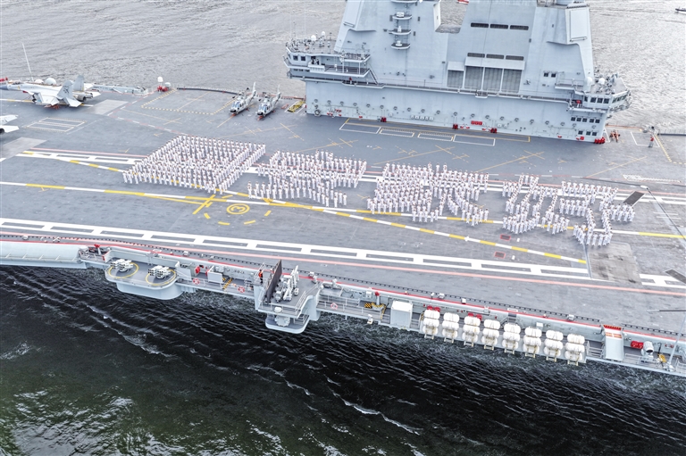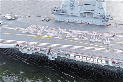 山东舰官兵在飞行甲板上列队排出“国安家好”字样