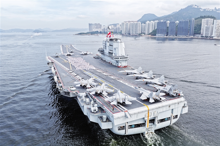 在香港回归祖国28周年之际,由中国人民解放军海军航空母舰山东舰,导弹驱逐舰延安舰、湛江舰及导弹护卫舰运城舰组成的航母编队,携多型舰载战斗机、直升机和陆战队员,于7月3日上午抵达香港特别行政区,开启为期5天的访问活动。