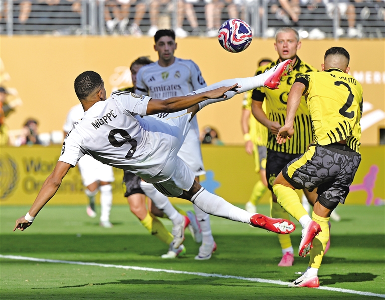 最后一场1/4决赛,皇马与德甲多特蒙德队展开激战,贡萨洛·加西亚和弗兰·加西亚上半场连进两球,帮助“银河战舰”取得优势。伤停补时阶段,“大黄蜂”由拜尔追回一球,但姆巴佩立即打入精彩的凌空侧钩,为球队再次取得两球优势。最后时刻,吉拉西罚入点球,但已无力回天,皇马3:2拿下胜利。