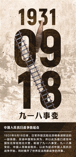1931年9月18日夜,日军炸毁沈阳北郊柳条湖附近的一段铁路,反诬中国军队所为,并以此为借口进攻中国东北军驻地北大营,制造了九一八事变。九一八事变后,中国人民奋起抵抗,以此为起点中国人民抗日战争开始,同时揭开了世界反法西斯战争的序幕。 |