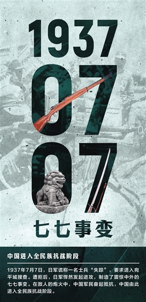 1937年7月7日,日军谎称一名士兵“失踪”,要求进入宛平城搜查。遭拒后,日军悍然发起进攻,制造了震惊中外的七七事变。在敌人的炮火中,中国军民奋起抵抗,中国由此进入全民族抗战阶段。 |