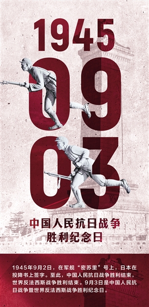 1945年9月2日,在军舰“密苏里”号上,日本在投降书上签字。至此,中国人民抗日战争胜利结束,世界反法西斯战争胜利结束。9月3日是中国人民抗日战争暨世界反法西斯战争胜利纪念日。 |