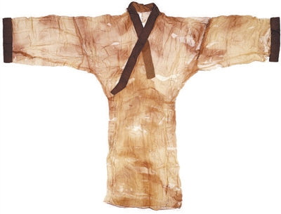 马王堆一号汉墓出土了薄如蝉翼、轻若烟霞的两件素纱襌衣,分别为直裾与曲裾,直裾素纱襌衣重49克,曲裾素纱襌衣重48克。素纱质地稀疏透风、轻薄飘逸,正如古诗中所讲的“轻纱薄如空”,是秦汉时期制作夏服和衬衣最流行的面料,也是世界上最轻薄的织物之一,据说从周代就开始广泛运用,《周礼》中即有“素沙”一词(“沙”即“纱”)。