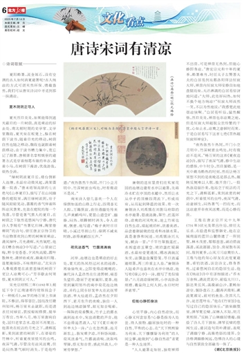 河岸、池塘边也是乘凉的好去处,夏天的热风经过河水的浸渗,再徐徐吹来,立即变得凉飕飕的。唐代诗人孟浩然在仕途困顿、痛苦失望后,隐居于老家襄阳。夏季,他常到襄阳郊外的南亭荷花池边纳凉,并约上同乡好友辛大在此抚琴饮酒。辛大仙逝后,孟浩然在夕阳西下、素月东升的夜晚,独自一人到池边纳凉弹琴,却无知音喝彩。一阵阵的荷香飘来,竹子上的露水滴到池水中,发出清脆的声音,他不由得追思故人,写下《夏日南亭怀辛大》一诗:“山光忽西落,池月渐东上。散发乘夕凉,开轩卧闲敞。荷风送香气,竹露滴清响。欲取鸣琴弹,恨无知音赏。感此怀故人,中宵劳梦想。”