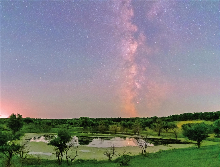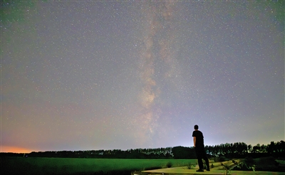 夏季是银河最佳观赏季,七八月入夜后,银河会从东北方地平线的位置向南方延伸,横跨整个夜空。当银河最亮的银心部分过上中天时,银河看起来会与地面垂直而立,银白色的“光瀑”仿佛从高空直泻而下,展现出“银河落九天”的壮丽景象。 (据新华社报道)