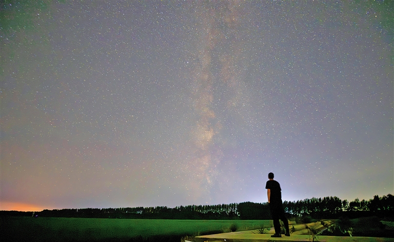 在黑龙江省双鸭山市友谊县,星空摄影爱好者在观赏“银河垂立”景象。