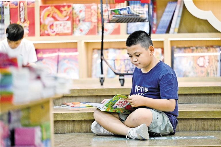 7月27日,小朋友在呼和浩特市青城阅立方书店阅读。正值暑期,呼和浩特市不少市民走进书店,在浓浓书香中度过休闲时光。摄影/新华社记者 李志鹏